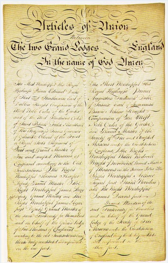 Em 25 de novembro 1813, os Grãos Mestres de ambas Grandes Lojas, os dois irmãos reais, o Duque de Sussex e o Duque de Kent, representando os Modernos e os Antigos, respectivamente e os seus comissários, seis no total, reuniram-se no Palácio de Kensington, com o único propósito de assinar dois manuscritos originais idênticos dos Artigos de União, um para cada Grande Loja. O documento original pertencente aos Antigos existe na Biblioteca e Museu da Maçonaria em Londres. É tme 205 milímetros de largura e 324 milímetros de altura, composto por um total de 10 páginas com texto em ambos os lados de cada página e os últimos três lados deixados em branco. Eles são assinados na página 7, cada selo de cera de cada signatário acrescentado sob a legenda: “Feito no Palácio de Kensington, neste dia 25 de novembro, no ano de Nosso Senhor 1813, e da Maçonaria 5813″ como segue: no lado esquerdo pelos Antigos – Edward G.M. (HRH Edward, Duque de Kent & Strathearn) Thos Harper DGM (Thomas Harper Grão Mestre Adjunto) Ja Perry PDGM (James Perry Past Grão-Mestre Adjunto) e Jas Agar PDGM (James Agar Past Grão-Mestre Adjunto) e no lado direito, pela Grande (ou Primeira) Loja dos Modernos mais quatro assinaturas: Augustus Frederick G.M. (HRH duque de Sussex Instalado em 12 de maio de 1813), Waller Rodwell Wright Pro G.M. Ilhas jônicas (Grão-Mestre Provincial das ilhas jônicas), Arthur Tegart PJGW (Past Segundo Grande Vigilante), J Deans PJGM (James Deans Past Segundo Grande Vigilante). Embora o duque de Kent fosse apenas Grão Mestre Eleito, neste momento, teria sido sentido que ele estava qualificado para assinar o documento como “Edward G.M.”. Cada Grande Loja reteve sua cópia do original assinado e selado dos s Artigos da União.
