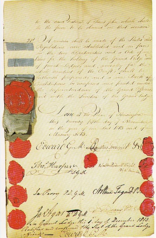 Ilustração: Os Artigos de União datados de 25 de novembro de 1813 e assinado com os selos dos dois Grãos Mestres e seus comissários. As últimas três linhas abaixo das assinaturas e selos são a ratificação e a confirmação “em Grande Loja ‘(ou seja, dos Antigos), datadas de 01 dezembro de 1813 e assinadas por “Edward” Grão-Mestre dos Antigos. O selo grande ao centro e à esquerda do documento também é o da Grande Loja dos Antigos. Este documento é preservado nos arquivos da Biblioteca e Museu da Maçonaria em Londres. Um documento idêntico com a assinatura do Duque de Sussex em sua base e o grande selo dos Modernos (ou Primeira) Grande Loja da Inglaterra está atualmente desaparecido.
