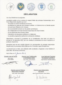 A declaração é assinada pelos cinco Grãos Mestres (Grande Loja de França, Grande loja da Aliança maçônica da França, Grande Loja Tradicional e Simbólica Opera, Loja Nacional Francesa e Grande Loja Independente da França).