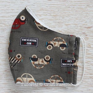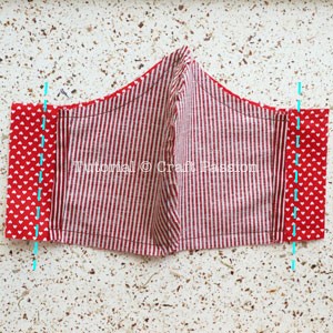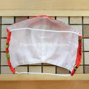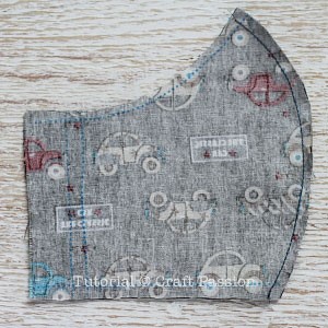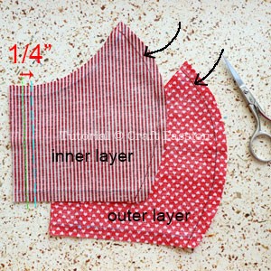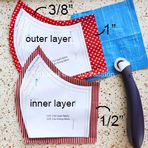 Corte o tecido com uma folga de costura de 0.90 cm, exceto o lado da máscara facial: 2.5 cm para a camada externa, 1.25 cm para a camada interna.