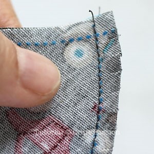 Dobre duas vezes as bordas brutas superior e inferior da camada externa (ambos os lados). Pesponte próximo à borda, como mostra a figura. Repita o mesmo para a linha de costura inferior.