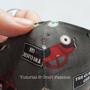 Prenda a curva junto com a margem de costura e corte picotes em V no tecido que sobra, para permitir que a máscara fique protuberante, com espaço para o nariz. Tenha cuidado e não corte acidentalmente os pontos.