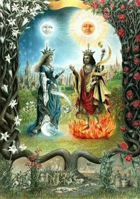 Às vezes eles estão nus, preparando-se para consumar seu casamento que eventualmente levará a uma prole alegórica, os Rebis.