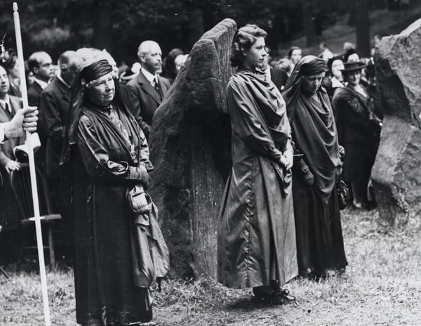 6 de agosto de 1946. A princesa Elizabeth (mais tarde Rainha Elizabeth II) vestida em um balandrau verde, sendo iniciada no Místico Círculo de Bardos pelo Arquidruída Crwyss Williams no Festival Eiseddfod nacional do País de Gales, em Mountain Ash, em Glamorgan.
