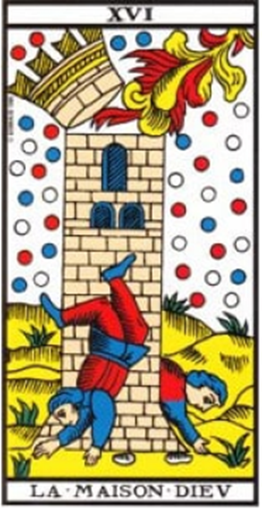 No Tarô de Marselha, o Arcano XVI, “a casa de Deus”, representa uma torre atingida por uma chama (fogo divino), que parece desencadear um turbilhão de bolhas, a derrubada de dois personagens e a queda de uma coroa.