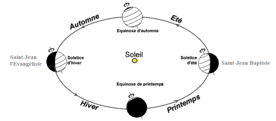 No solstício de verão, as fogueiras de São João (originalmente uma festa pastoril e agrícola) acontecem ao ar livre, no final da tarde: o fogo nocturno prolonga o dia, que foi no entanto o mais longo do ano.  Trata-se de repelir essas trevas que inexoravelmente começarão a dominar a luz até o solstício de inverno, momento a partir do qual a luz vencerá pouco a pouco a escuridão.