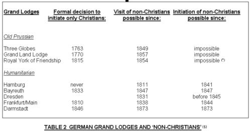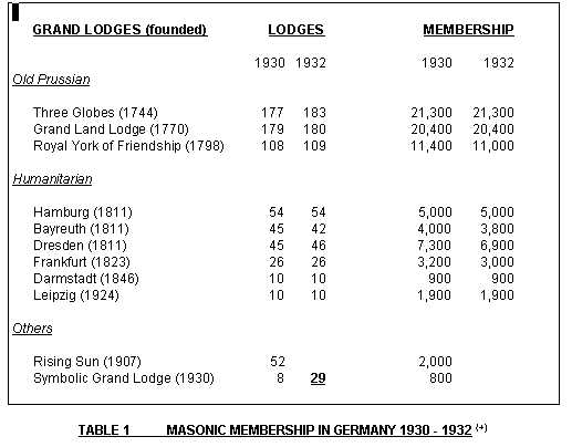 No início da década de 30, a Alemanha tinha cerca de 75.000 maçons  e nove Grandes Lojas regulares  cuja importância numérica era muito diferente (Tabela 1). Cerca de dois terços dos irmãos pertenciam às três mais antigas e de orientação cristã e naquela época  Grandes Lojas fortemente nacionalistas fundadas no século 18 que eram chamadas de ‘Velhas Prussianas”, porque foram fundadas e tiveram usas sedes em Berlim. Elas nunca iniciaram “não-cristãos”, a expressão então usual para designar judeus. Ao longo do século XIX, mais cinco Grandes Lojas alemãs foram fundadas e mais uma em 1924. Elas eram chamadas de “humanitárias” e iniciaram homens de qualquer denominação religiosa (ver Tabela 2). Em 1922, as Antigas Grandes Lojas Prussianas decidiram retirar-se da Aliança Alemã de Grandes Lojas  em 1872, explicando: «  Há uma fronteira que diferencia fortemente as humanitárias da Antiga maçonaria nacional Prussiana. Nós, as três Grandes Lojas  Prussianas Antigas, nos recusamos a fazer parte do movimento  de confraternização humanitário geral entre as pessoas do mundo. »(Steffens, p. 332)
