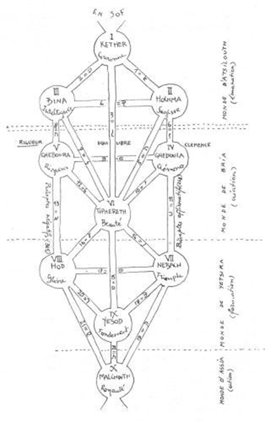 Esquematicamente, a árvore sefirot (fig. 1) (foto nº 2) é composta por um gráfico de dez sefirots. Cada sefira tem um valor abstrato, cuja expressão permanece apenas a indicação de uma direção de pesquisa que é acima de tudo pessoal, metafísica. Essas sefirot são as seguintes, de baixo para cima: Malkut (o reino), Jesod (a fundação), Hod (glória resplandecente), Netsah (vitória, triunfo), Tipheret (beleza), Geburah (rigor, severidade), Gedulah (grandeza, magnificência), Binah (inteligência, compreensão), C’hochmah (sabedoria), Kether (a coroa). A união das três primeiras sefirot além de Malkut (o reino): Jesod, Hod, Netsah constitui o “ternário dinâmico”, Netsah representa o princípio gerador do movimento, Hod a lei segundo a qual o trabalho construtivo universal é organizado e, finalmente, Jesod o plano determinado do que deve ser feito, o órgão gerador.