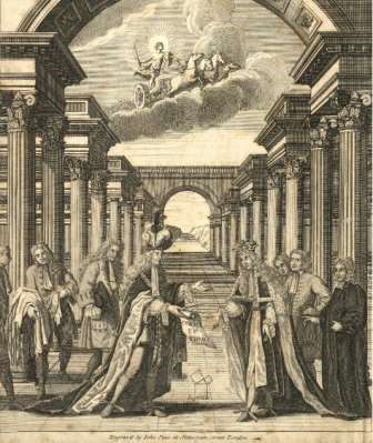 Entre o conteúdo em A Constituição de Anderson (1723), o frontispício[4] gravado por John Pine[5] (1690–1756), um importante gravador londrino, é impressionante. Em seu relacionamento com a Maçonaria, ele também produziu os primeiros diretórios de lojas maçônicas detalhando os nomes, sinais, lugares e datas das reuniões da loja. Cherry (2016) aponta a importância desse elemento no trabalho: