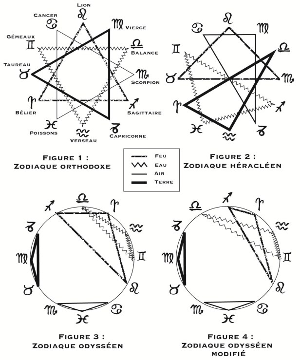 O zodíaco Odisseiano revela uma ordem mais curiosa, rejeitando o Ar e a Terra em dois triângulos idênticos, mas excluídos, e dando um entrelaçamento para a Fogo Água, mas baseado em trígonos dissimilares. Este desequilíbrio é apenas em Libra e Sagitário. Como interpretar seus respectivos lugares?