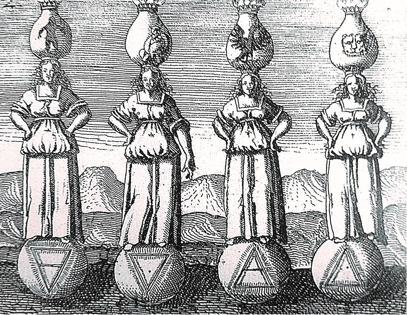 Gravura extraída do tratado de Daniel Stolz von Stolzenberg, Viridarium chymicum (1624). Da esquerda para a direita, os quatro elementos da Materia Prima, “Primeira Matéria”, a Terra, a Água, o Ar e o Fogo. Sobre as esferas, sua representação alquímica.