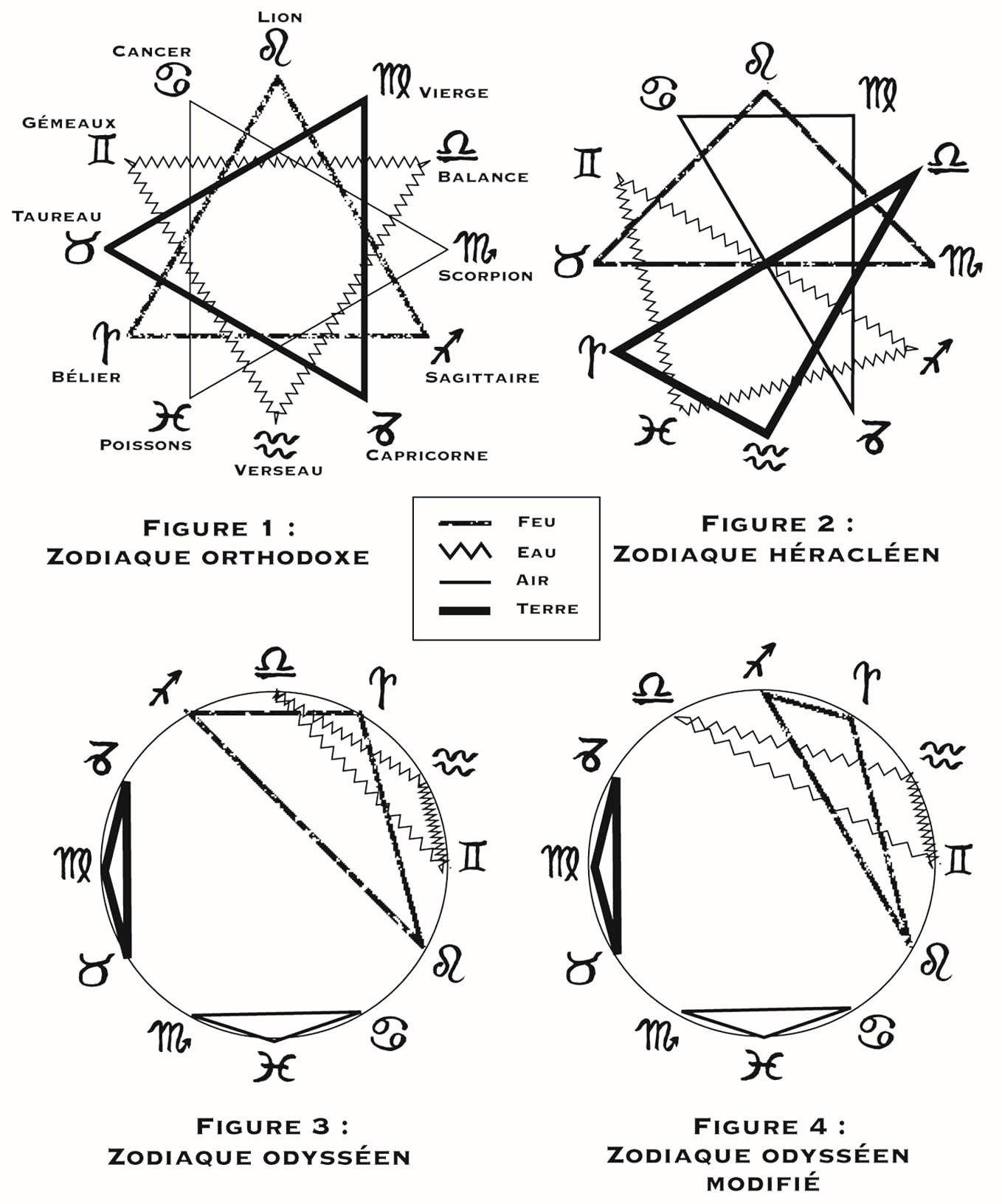 Quanto às viagens de Ulisses, qual é a ordem delas? A composição zodiacal da Odisseia não é uma duplicata da de Hércules, adaptada da lenda de Gilgamesh vinda da Mesopotâmia, ela é específica de um povo marítimo. Essas viagens foram listadas nessa ordem: Lotófagos, Ciclopes, Éolo, Lestrígones, Circe, Cimérios, Sereias, Scila e Caríbdis, Bois de Hélios, Calipso, a Mansão dos Feácios, o Combate dos Pretendentes. A correspondência zodiacal da Odisseia então se anuncia: Libra – Áries – Aquário – Gêmeos – Leão – Câncer – Peixes – Escorpião – Touro – Virgem – Capricórnio – Sagitário. Em comparação com a lista de constelações visíveis, é novamente a desordem completa.