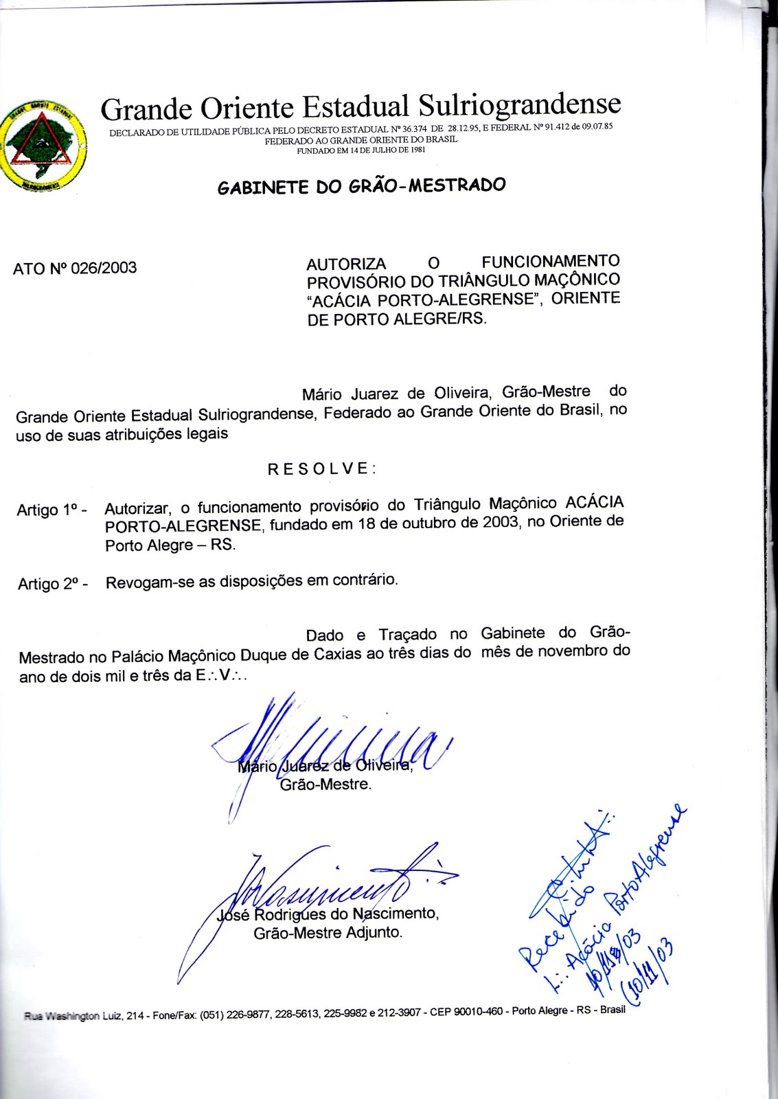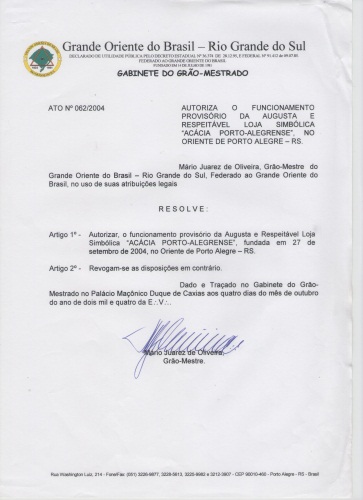 Pelo Ato nº 062/2004, de quatro (04) do mês de novembro de 2004, do Gabinete do Grão-Mestrado, ficou autorizado o funcionamento provisório da Loja Acácia Porto-Alegrense.