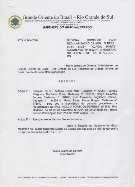 Pelo Ato nº 064/2004, do dia oito (08) de novembro de 2004, Gabinete do Grão-Mestrado Estadual, ficou designado a Comissão de Regularização da Augusta e Respeitável Loja Simbólica Acácia Porto-Alegrense nº 3612, presidida pelo Irmão Antônio Onias Neto, CIM nº 129.591.