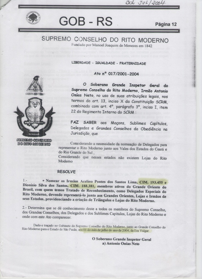 Em primeiro de julho de 2004, sai à nomeação do 1º Delegado Especial do Rito Moderno para o Estado do Rio Grande do Sul, conforme Ato nº 017/2001-2004, do Soberano Grande Inspetor Geral do Supremo Conselho do Rito Moderno, publicado na pág. 12 do Boletim Oficial do GOB-RS de julho de 2014, conforme documento ora anexado.