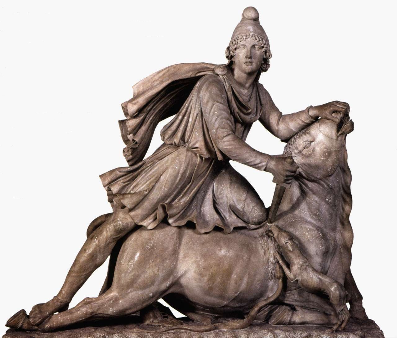 Os estudos clássicos do belga Franz Cumont (1913) que provaram ser os mistérios mitraícos derivados das antigas religiões iranianas explica parcialmente como a cena da morte do Touro – conhecida como tauroctonia – inexiste na mitologia iraniana com a figura de Mitra. Cumont responde que teria encontrado textos que apresentavam o matador do touro como Ahriman, ou seja a força cósmica do mal na religião iraniana.
