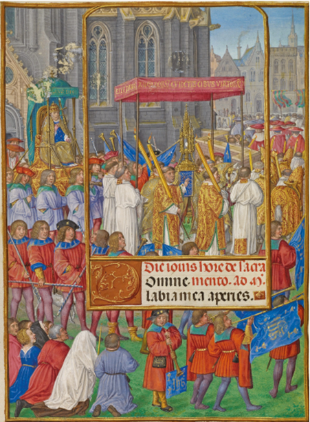 Observe os estandartes e as roupas de cores diferentes das fraternidades separadas em procissão antes do sacramento no canto superior direito. Flamengo, século XVI. Original conservado pelo Museu John Paul Getty, Ms. Ludwig IX 18, fol. 48v. Com a gentil permissão do Museu J. Paul Getty.
