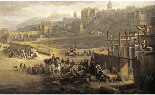 Observe-se os pedreiros trabalhando, sua loja (centro à esquerda), o andaime e o guindaste. Alexander Nasmyth (1758-1840), Rua Princes com o Início da Construção da Instituição Real (1825), NGS, NG 2542. Com a gentil permissão das Galerias Nacionais da Escócia. Apresentado pelo senhorDavid Baird, 1991.