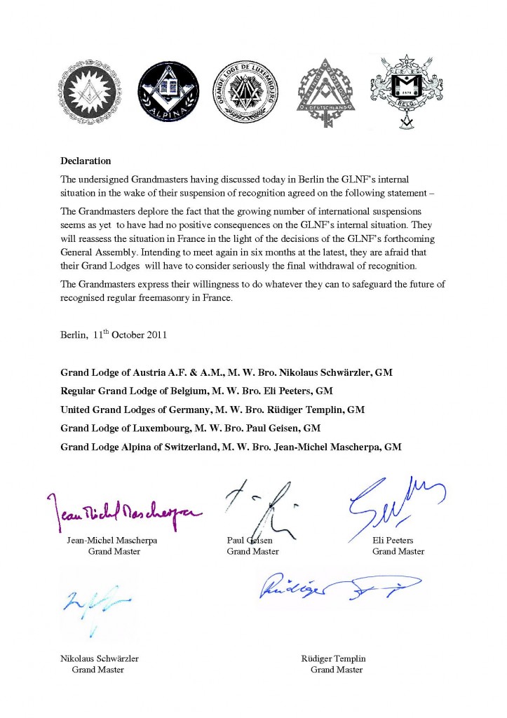 Os Grãos Mestres das Grandes Lojas Regulares dao Áustria , da Bélgica , da Alemanha , de Luxemburgo e da Suíça assinaram ontem em Berlim uma declaração muito contundente sobre a Grande Loja Nacional Francesa (GLNF). Eles anunciam que, dentro de no máximo seis meses poderão decidir a retirada de seu reconhecimento dado à GLNF do Grão-Mestre François Stifani. Esta declaração assinada ontem, foi enviada hoje às Grandes Lojas do mundo … e ela nos foi enviada. Quase à velocidade da Luz .
