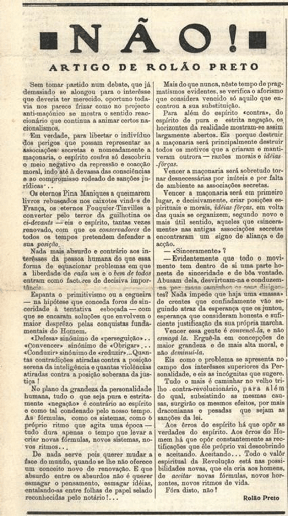 [34] Rolão Preto, “Não!”, Fradique n.º 14 de Março de 1935, p. 1.