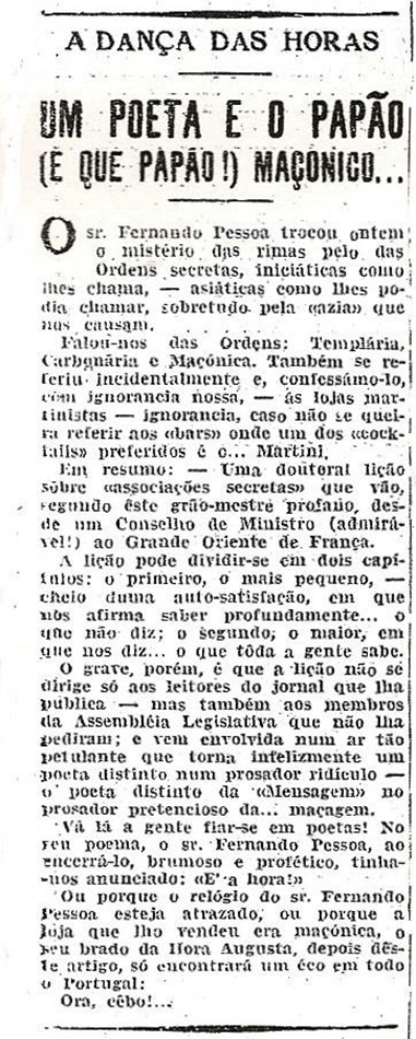 [24] “A dança das horas. Um poeta e o papão (e que papão!) maçónico”, Diário da Manhã, 5 de Fevereiro de 1935, p. 1.