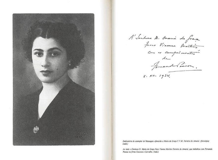 [29] Isabel Murteira França, Fernando Pessoa na Intimidade (Lisboa: Dom Quixote, 1987), pp. 149152. O livro contém o fac-simile da dedicatória autógrafa de Pessoa, no livro Mensagem, a Maria da Graça Facco Vianna Martins, datada de Dezembro de 1934.