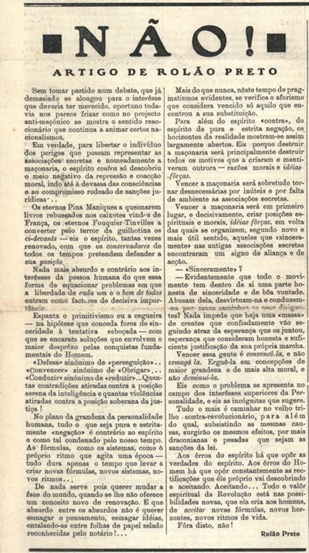 [34] Rolão Preto, “Não!”, Fradique n.º 14 de Março de 1935, p. 1.