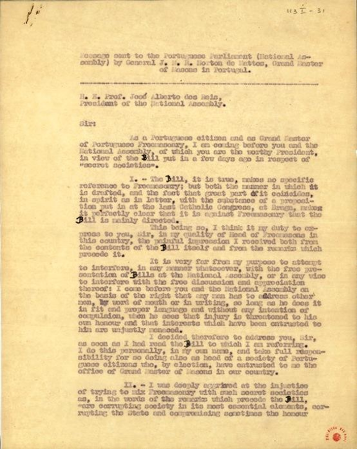 2. Perante as primeiras notícias, a 19 de Janeiro, sobre a iniciativa legislativa do deputado José Cabral, não tardou muito a reacção da própria Maçonaria que, abrindo uma excepção à sua estrita regra de silêncio, veio a público defender-se. Uma carta de protesto subscrita pelo general Norton de Matos, grão-mestre do Grande Oriente Lusitano, e datada de 31 de Janeiro de 1935 foi enviada ao presidente da Assembleia Nacional, o antigo maçon José Alberto dos Reis. O GOL era a obediência maçónica que, com mais de 3.000 associados[7] e uma clara orientação anti-Ditadura e anticlerical, estava principalmente na mira do projecto de lei. Cópias da carta circularam de mão em mão, pois a censura impediu que o documento chegasse às páginas dos jornais e a própria notícia da sua recepção pela Assembleia Nacional foi cortada pela censura no jornal República de 7 de Fevereiro. Na sua carta, Norton de Matos contestava a aplicação do conceito de associação secreta à Maçonaria, cujos fins, dirigentes e actividades seriam, na sua opinião, suficientemente do conhecimento público. Lembrava as perseguições de que as lojas maçónicas eram objecto tanto na Rússia comunista como sob os regimes fascista e nazi, evocava grandes figuras maçónicas da história portuguesa e alertava, enfim, para o facto de que a Maçonaria, quando perseguida, tinha sempre ressurgido nos países em que se encontrava estabelecida.[8]