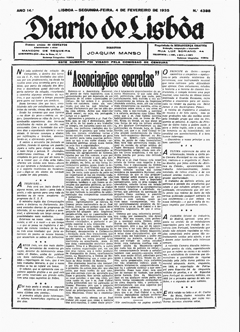PIMENTA, Alfredo: “A verdade sobre a Franco-Maçonaria”, A Voz, 7 de Fevereiro de 1935, p. 1.