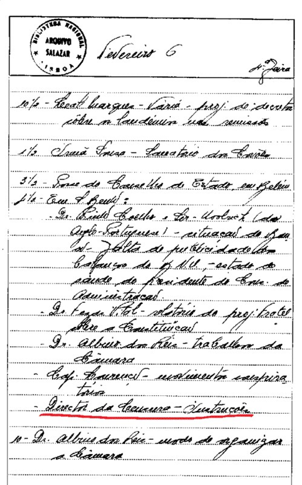 [42] ANTT/AOS/1/5/37, Agenda de 1935, dia 6 de Fevereiro. Numa entrada do dia, lê-se: “Director da Censura – Instruções”.