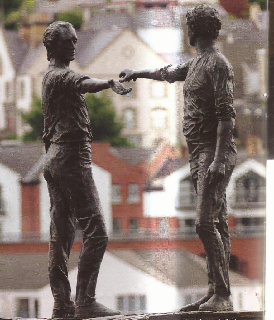 Escultura de Maurice Harron, erigida em 14991 em Derry, na Irlanda do Norte. Dois homens se estendem as mãos sem conseguir se tocar. Sob dominação inglesa, portanto protestante até 1921, depois sob o peso da Inglesa católica, a Irlanda será por muitos séculos o teatro de conflitos sangrentos. Considerado ainda hoje uma questão inglesa e protestante, a Maçonaria suscita desconfiança na Irlanda muito católica.