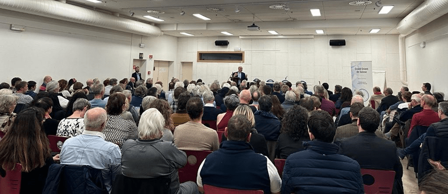 Foi em frente a uma casa cheia e depois de algumas palavras de boas-vindas do Respeitável Grão-Mestre do Grande Oriente da Suíça, Christophe Ravel, que Alain Bauer começou com uma breve apresentação do que é a Maçonaria antes de se apresentar.