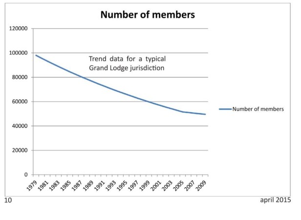 Em 1959, o número de maçons nos Estados Unidos chegou ao auge e começou a declinar. Na história conhecida da Maçonaria, pelo menos desde que se vem contando os Maçons, o número de membros em nossa Fraternidade subiu e desceu, mas isso foi, de longe, o maior número de membros que já tivemos. Quando eu falo de Maçonaria, eu incluo a Loja Azul da Maçonaria Simbólica e todas as outras organizações que predicam sua participação na Loja ou estão de algum modo associadas a ela. Eu geralmente me refiro apenas à Maçonaria dentro dos Estados Unidos. A fraternidade havia estabelecido uma infraestrutura interna elaborada e extensa. Cada um dos nossos corpos tinha funcionários em níveis estadual e nacional e muitos em nível local. Além disso, a maioria dos corpos estabeleceu filantrópicas estaduais ou nacionais que empregavam literalmente milhares de pessoas. Tínhamos hospitais, lares de órfãos, comunidades de aposentados, fundações e instituições educacionais. Além das folhas de pagamento, havíamos herdado ou construído um grande número de edifícios. Tínhamos edifícios de Lojas, edifícios de Grande Lojas, Templos de Rito Escocês, Templos de Rito de York, Templos de Shrine, orfanatos, hospitais, museus, bibliotecas e escolas, sem mencionar o espaço de escritório necessário para administrar toda essa infraestrutura. Tudo isso era apoiado financeiramente pelos nossos membros através de taxas, contribuições, esforços de angariação de fundos, e às vezes retornos de investimentos que alguns de nossos predecessores mais sábios haviam feito com essa finalidade.