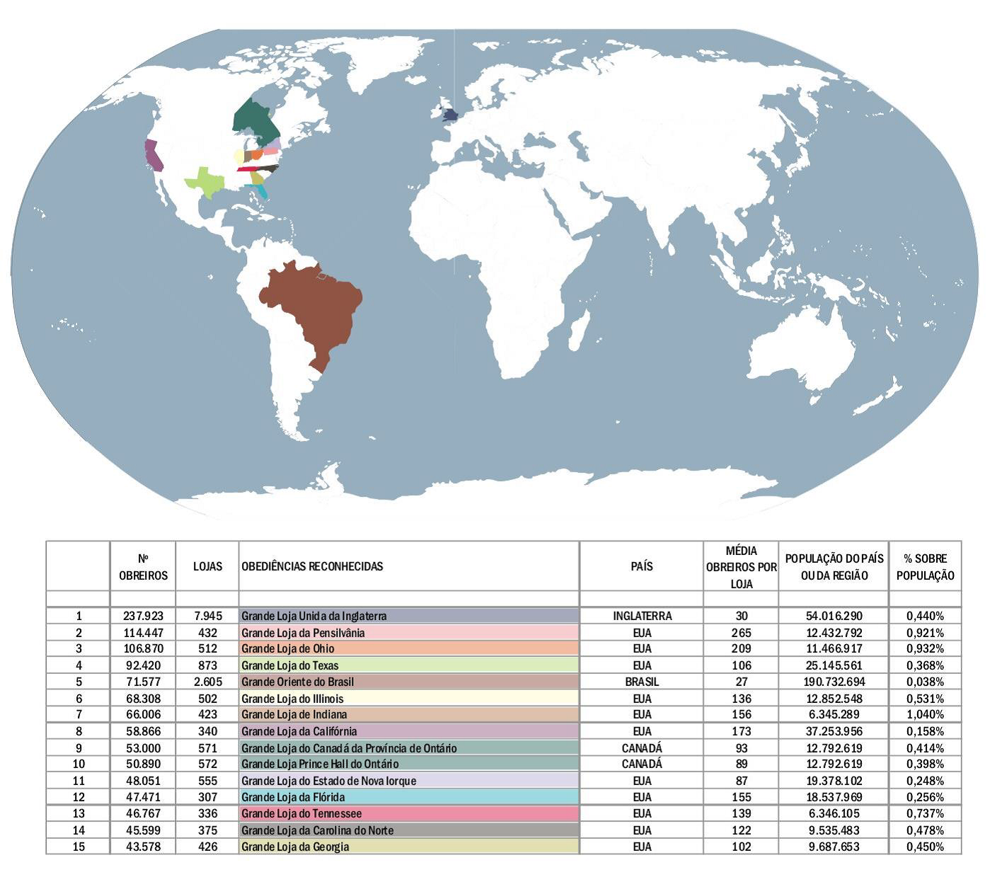 A Obediência com o maior número de Lojas e Obreiros é a Grande Loja Unida da Inglaterra (237.923 Obreiros e 7.945 Lojas, com uma média de 30 Obreiros por Loja); seguida pela Grande Loja da Pensilvânia (EUA) (114.447 Obreiros e 432 Lojas, com média de 265 Obreiros por Loja); Grande Loja de Ohio (EUA) (106.870 Obreiros, 512 Lojas, média de 209 Obreiros por Loja); Grande Loja do Texas (EUA) (92.420 Obreiros, 873 Lojas, média de 106 Obreiros por Loja) e em 5ª posição, o Grande Oriente do Brasil (71.577 Obreiros, 2.605 Lojas e média de 27 Obreiros por Loja).