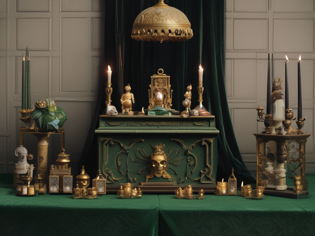 No meio da sala erguia-se um altar, contendo elementos rituais descritos com precisão: um livro de veludo negro, apenas um pouco adornado com ouro; uma pequena vela sobre um candelabro de marfim; uma esfera, ou globo celeste; um pequeno relógio; uma pequena fonte tubular de cristal; um crânio, dentro do qual estava uma serpente branca.