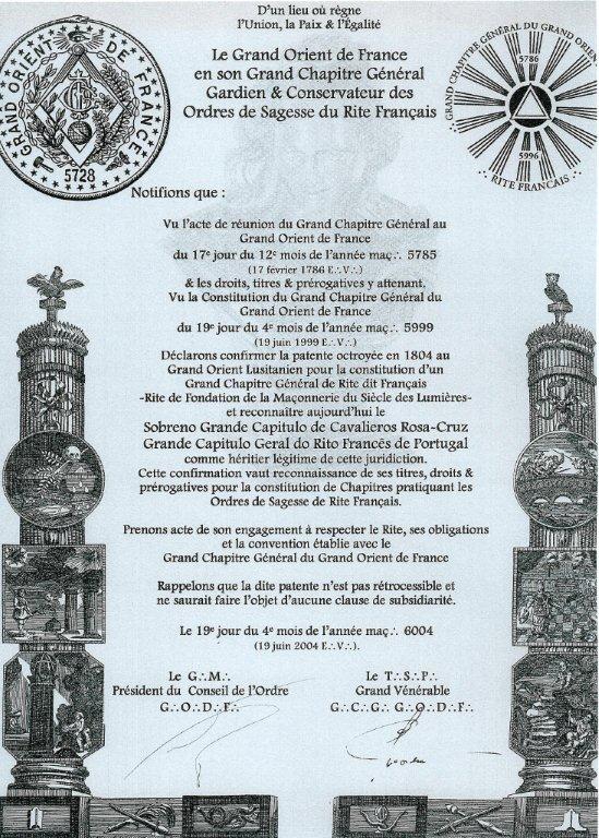 Em 1804 o Grande Oriente de França outorga ao Grande Oriente Lusitano uma carta constitutiva para a fundação de um Grande Capítulo Geral do Rito Francês (ou Moderno).