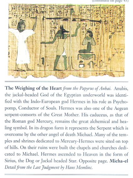 Em sua tradução do Corpus Hermético, uma obra teosófica escrita por volta de 300 d.C. misturando antigas ideias gnósticas, herméticas e egípcias, G. R .S. Mead (1992), diz que os egiptólogos equiparavam o Anjo, a quem ele chama de Agathodaimon, a Hermes e Thoth de Hermópolis e, finalmente, Hermes Trismegisto: “Thoth é caracterizado como o Aeon dos Aeons que se transforma em todas as formas em visão, … [O] Bom Daimon, que tem nomes diferentes dados a ele nas diferentes horas, [e] é chamado de ‘Aeon da Riqueza’” (pág. 280). Ele também é “a poderosa serpente, o chefe de todos os deuses… que possui o início do Egito e o fim de todo o mundo” (p. 67). O Egito é uma antiga metáfora para a vida física, por isso esta poderosa serpente carrega os segredos da jornada entre o início e o fim da vida: o destino humano.