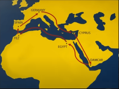 Enfrentando ali o infortúnio, ele então buscou conhecimento dos sábios de Damkar, na Arábia, onde adquiriu sabedoria esotérica antiga cobrindo diversos campos como física, matemática, magia e Cabala. Sua jornada continuou pelo Egito e Fez com uma parada notável entre os Alumbrados na Espanha. Curiosamente, algumas interpretações de relatos postulam que sua peregrinação alude aos passos da transmutação da Grandes Obra.