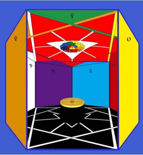 “Os sete lados são todos iguais em tamanho, forma e subdivisão, e os 40 quadrados de cada lado trazem os mesmos símbolos, mas a coloração é variada ao extremo; nenhum dos dois lados é igual em tonalidade e nenhum dos quadrados é idêntico em cor, exceto o único quadrado superior central de cada parede, aquele quadrado com a Roda do Espírito. As sete paredes estão sob a presidência planetária, um lado de cada planeta. Os quadrados subsidiários representam a coloração das forças combinadas do planeta. O símbolo de cada quadrado é representado pela cor do fundo, enquanto o símbolo está na cor contrastada ou complementar à do fundo”.