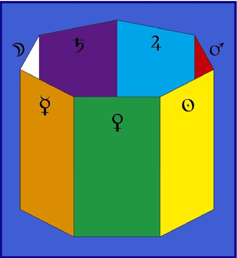 “Os sete lados são todos iguais em tamanho, forma e subdivisão, e os 40 quadrados de cada lado trazem os mesmos símbolos, mas a coloração é variada ao extremo; nenhum dos dois lados é igual em tonalidade e nenhum dos quadrados é idêntico em cor, exceto o único quadrado superior central de cada parede, aquele quadrado com a Roda do Espírito. As sete paredes estão sob a presidência planetária, um lado de cada planeta. Os quadrados subsidiários representam a coloração das forças combinadas do planeta. O símbolo de cada quadrado é representado pela cor do fundo, enquanto o símbolo está na cor contrastada ou complementar à do fundo”.