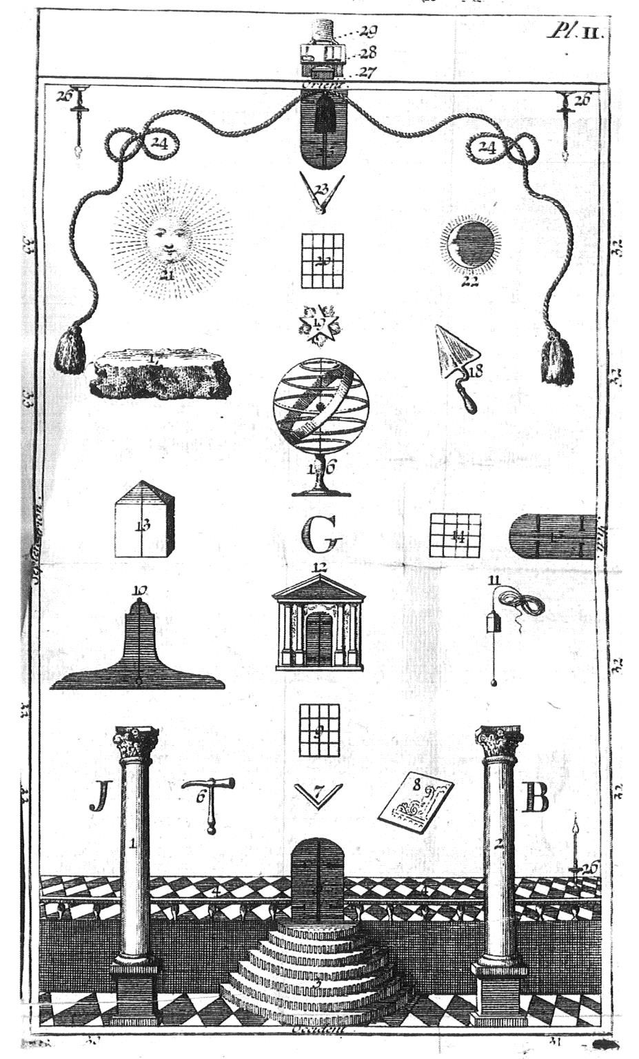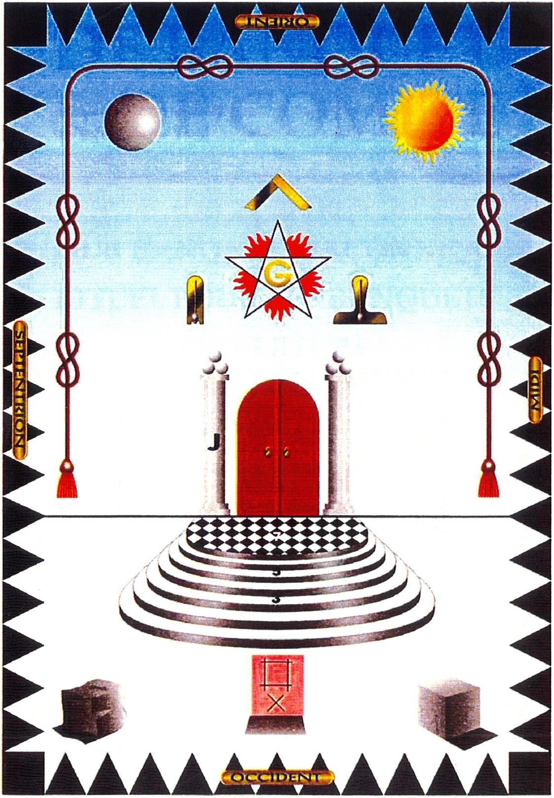 Os degraus são ladeados pelas duas colunas evocativas das existentes à entrada do Templo de Salomão, dispostas segundo a disposição moderna (J à esquerda – B à direita), uma vez que durante todo o século XVIII a Maçonaria masculina praticada em França derivou, essencialmente, desta tradição.