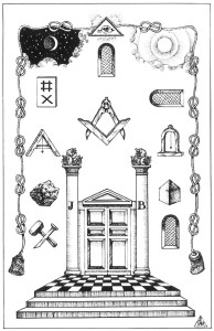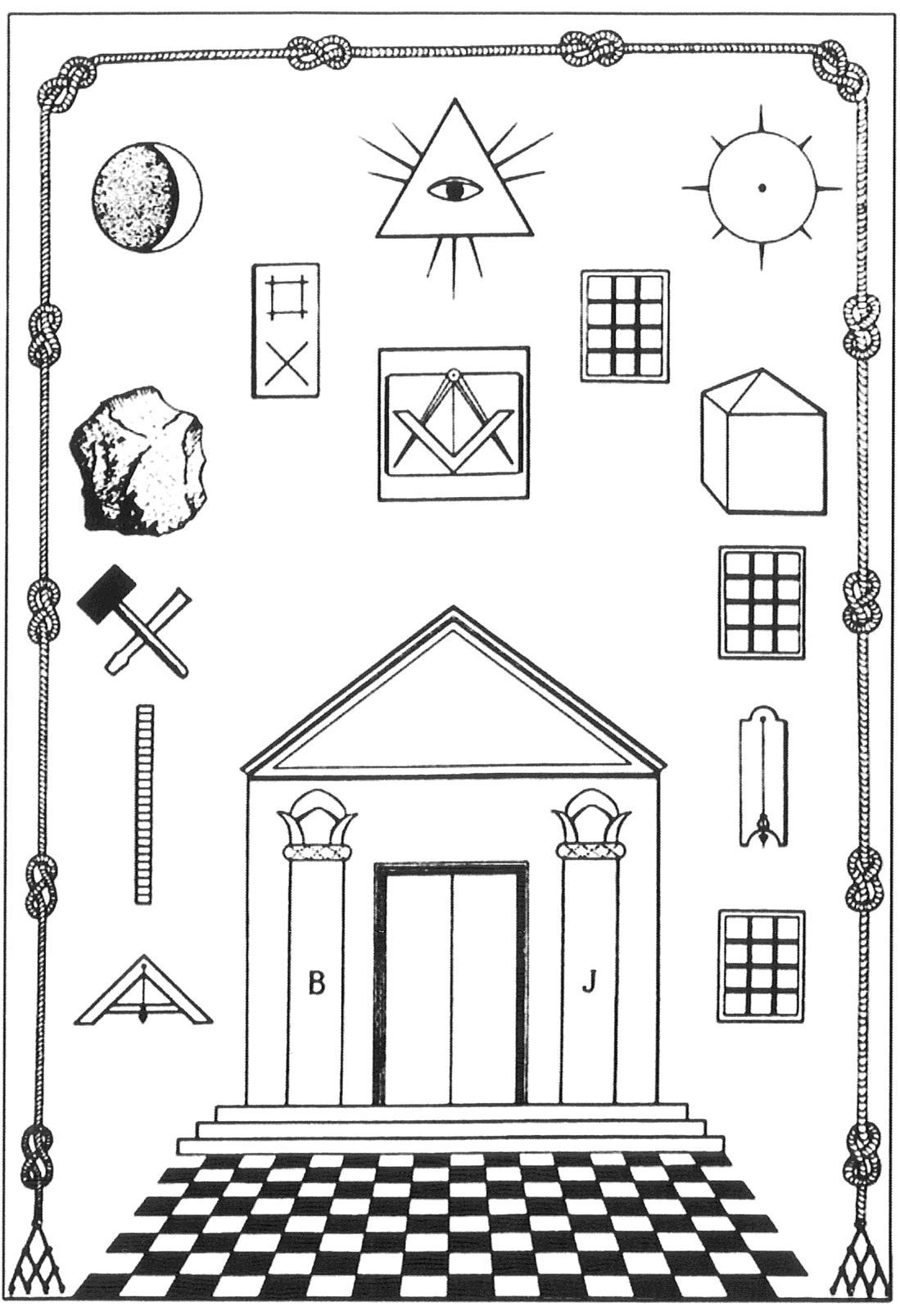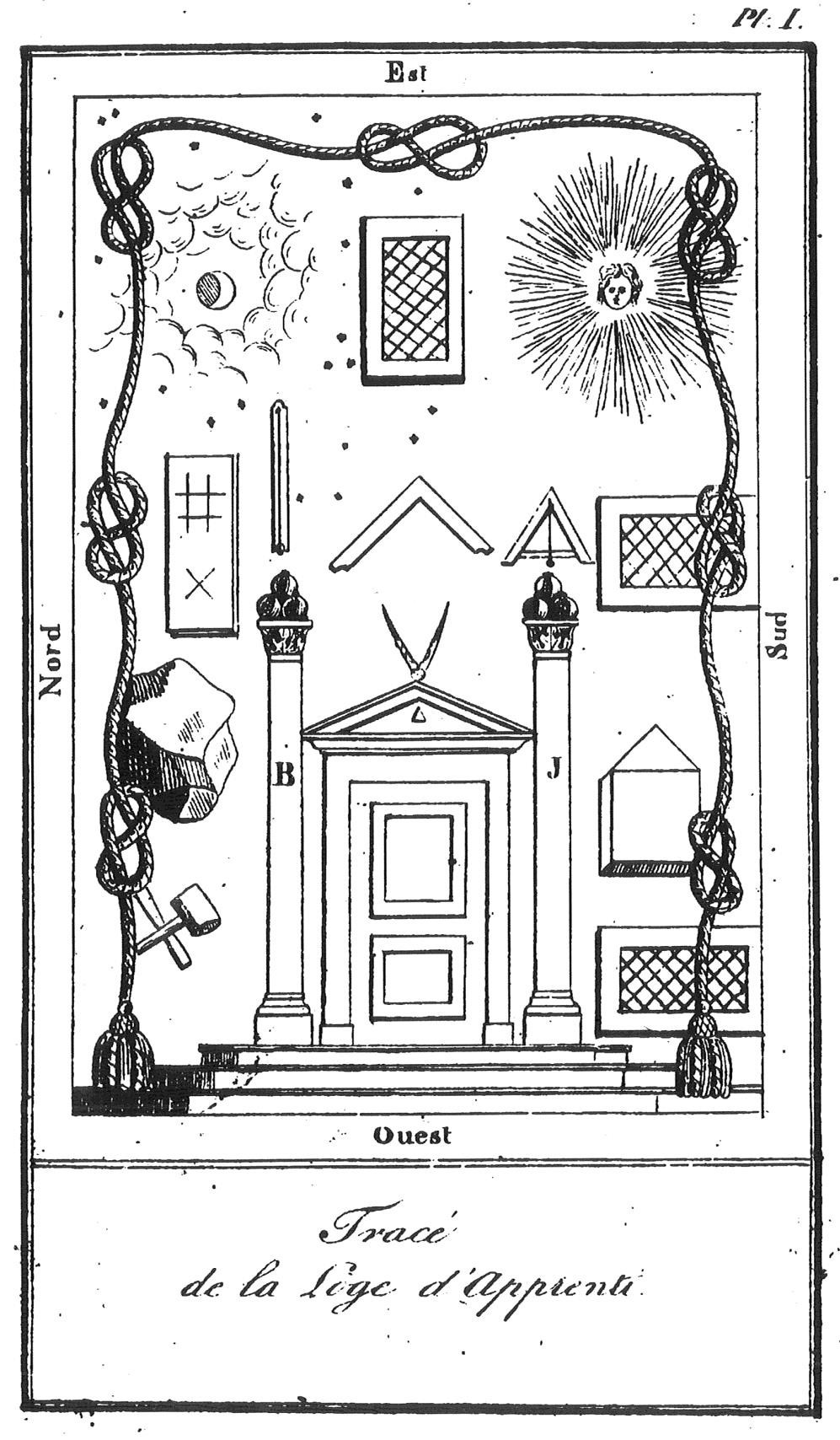 - Na mais antiga divulgação publicada em França, datada de 1737 e, denominada “Recepcion d’un frey-maçon”, documento este transcrito do relatório do tenente de polícia Herault, elaborado com base em informações recolhidas por Mle. Carton, corista da Opera de Paris, encontra-se a referência “em volta de um espaço delimitado sobre o pavimento, onde se desenhou a giz uma espécie de representação, sobre duas colunas do átrio do Templo de Salomão”.