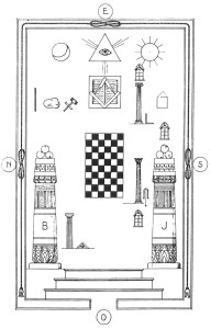 Aparecem-nos, assim, o pavimento de mosaico na sua forma reduzida (atualmente a mais utilizada em França), o Altar dos Juramentos com as três Grandes Luzes da Maçonaria agrupadas na posição correspondente ao Grau de Aprendiz, as Pedras Bruta e Trabalhada colocadas na sua disposição habitual em Loja, as ferramentas do Aprendiz situadas do lado da sua coluna e, as Joias Móveis dispostas nos locais onde se situam os altares dos Oficiais respetivos (Esquadro/Venerável Mestre Nível/1º Vigilante-Perpendicular/2º Vigilante).