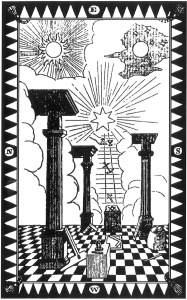 As colunas aparecem, em geral, encimadas por três romãs e, o frontão do Templo, que se sobrepõe à porta, normalmente é espiritualizado através da ostentação de um Delta Radiante.