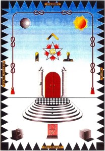 A porta, em alguns painéis fechada, noutros aberta, apresenta-se ladeada pelas duas colunas. Estas, nos Quadros de Loja do REAA, cujos graus simbólicos nasceram em 1804, encontram-se já dispostas segundo o posicionamento Antigo (J à esquerda – B à direita).