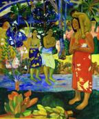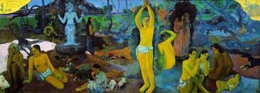 Em 1888, Gauguin havia escrito à sua esposa que os dois componentes de sua natureza, a sensível – de uma sensibilidade dada aos valores morais da civilização ocidental – e a indígena, apenas a indígena ainda estava viva. Ele sonhava enxertar na raiz selvagem uma nova poética. Como os navegadores do século XVIII em busca de um paraíso sexual, como os heróis de J. Conrad e R.L. Stevenson, ele era assombrado pela visão de uma ilha nos Mares do Sul, rodeada de calma extática, povoada por criaturas simples e misteriosas, onde os batimentos cardíacos seriam um só com o silêncio da noite e as amenas brisas, onde o divino renasceria nos ídolos encarnando “toda a natureza, reinando em nossa alma primitiva, consolação imaginária de nossos sofrimentos naquilo que eles contêm de vago e de incompreendido diante do mistério da nossa origem e de nosso futuro “. No Taiti, Gauguin experimentou a decepção de não encontrar ídolos. Ele precisou recriar uma mitologia polinésia através de um processo que teria sido uma mistificação, se ele não a tivesse tornado inseparável de seu universo artístico. Os deuses perseguidos pelos europeus recuperam em sua obrada uma existência mágica. O Taiti não tinha jamais possuído esculturas em pedra ou madeira comparáveis às da Ilha da Páscoa de que Gauguin tinha podido ver um espécime na Exposição Mundial de 1889, mas simplesmente postes enfeitados com pano, os anicônicos Atouas, efígies de deuses do céu erguido nos recintos sagrados (são vistos na tela Parahi te Marae, aqui é o templo dos sacrifícios)