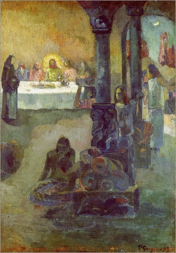 integra a mitologia, pela introdução do terror (figura de fantasmas, flores pintadas com fosforescências de fogo-fátuo) e a música, com tons de violeta, azul escuro, amarelo-laranja e amarelo esverdeado que dão uma atmosfera sombria e opulenta. Para Gauguin assim como para Mallarmé, qualquer coisa pode se tornar tema de poemas, mesmo uma religião esgotada repetida por um vidente sem raízes com as tetas de uma humanidade que permaneceu primitiva.