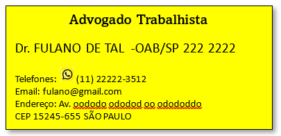 Pequenos Anúncios ADVOGADO TRABALHISTA – Dr. Fulano de Tal – OAB/RJ 123456 – Telefones: 11 – 99999-3412 Escritório: Rua Santo Antonio, 45555 – 10º andar – cj 43 – SAO PAULO/SP CEP 12345-000 Compartilhe isso: Clique para imprimir(abre em nova janela) Imprimir Clique para enviar um link por e-mail para um amigo(abre em nova janela) E-mail Clique para compartilhar no Facebook(abre em nova janela) Facebook Clique para compartilhar no X(abre em nova janela) 18+ Clique para compartilhar no Telegram(abre em nova janela) Telegram Clique para compartilhar no WhatsApp(abre em nova janela) WhatsApp Mais Clique para compartilhar no LinkedIn(abre em nova janela) LinkedIn Clique para compartilhar no Reddit(abre em nova janela) Reddit Clique para compartilhar no Tumblr(abre em nova janela) Tumblr Clique para compartilhar no Pinterest(abre em nova janela) Pinterest Clique para compartilhar no Pocket(abre em nova janela) Pocket Curtir Carregando...