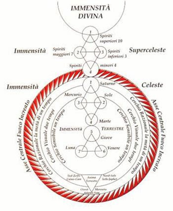 No Quadro Universal, por exemplo, é possível “visualizar” qual o papel e o lugar destinado aos primeiros seres espirituais; nele constam um semicírculo e 4 (quatro)[43] círculos concêntricos, parcialmente também presentes na logomarca dos Elus Cohen. Na parte superior está posicionado o Semicírculo da Imensidade Divina, correspondente ao Um já referido, e também ao algarismo 1 (um), condição necessária para que os números em geral sejam submetidos às operações (reduções e adições) teosóficas. É a partir do centro deste Semicírculo que o Eterno emana os primeiros espíritos pois, para MP só existem espíritos, o corpo físico (cujo surgimento adiante será apresentado) é, de fato, matéria aparente; em outros termos, somos espíritos (centelhas divinas) revestidos.