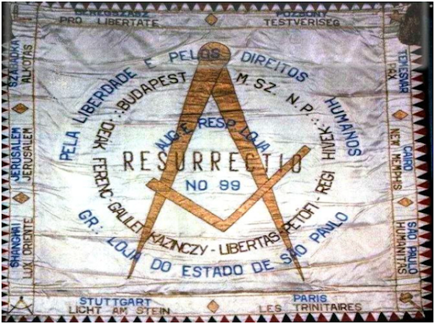 Figura 2 – Estandarte da Loja Resurrectio – nº 99. Em volta pode-se ver o nome das Lojas de Origem dos Irmãos Fundadores.